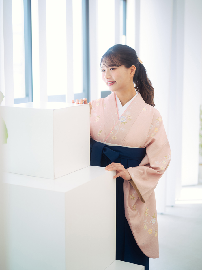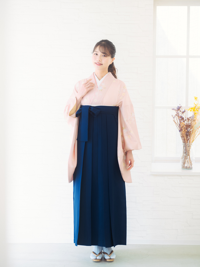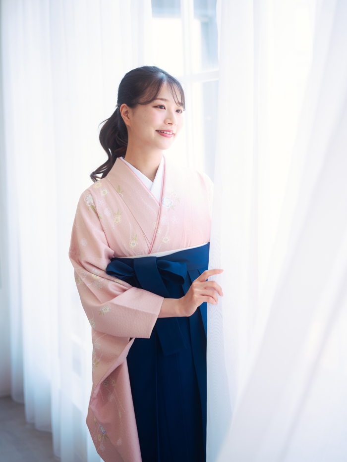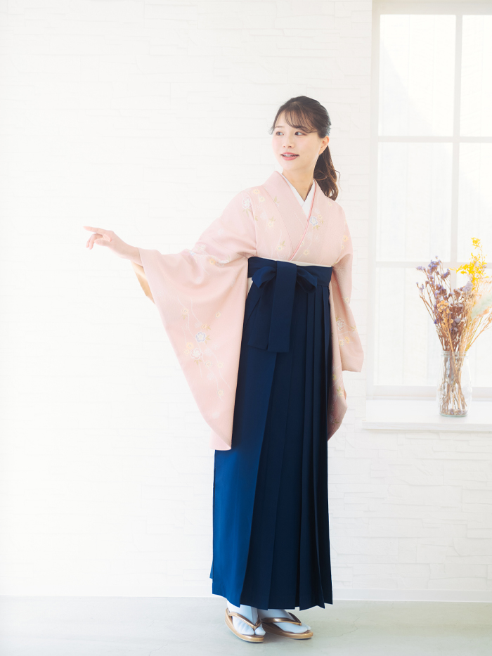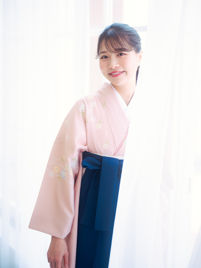 明るく優しいピンクの着物に、深みのある紺の袴を合わせた王道スタイル。