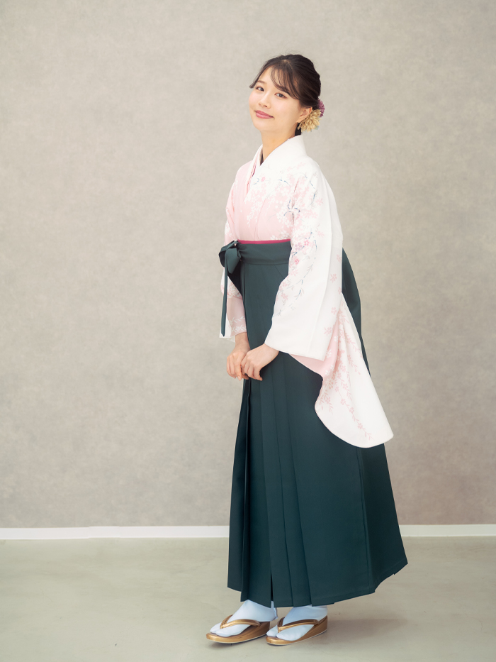 新コーデ 【二尺袖&袴レンタル】白地 しだれ桜+モスグリーン無地袴