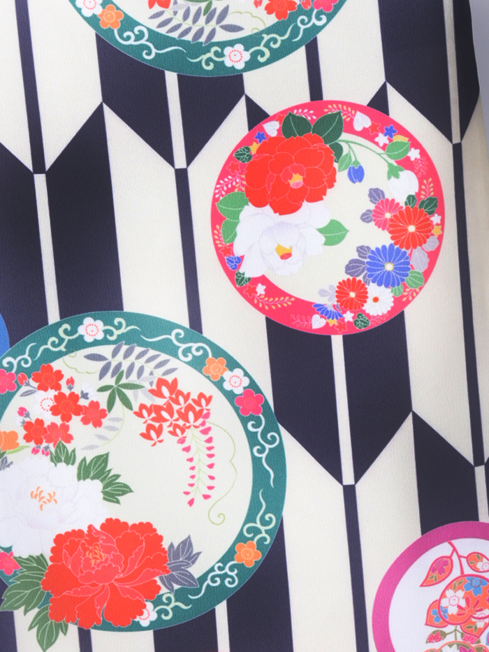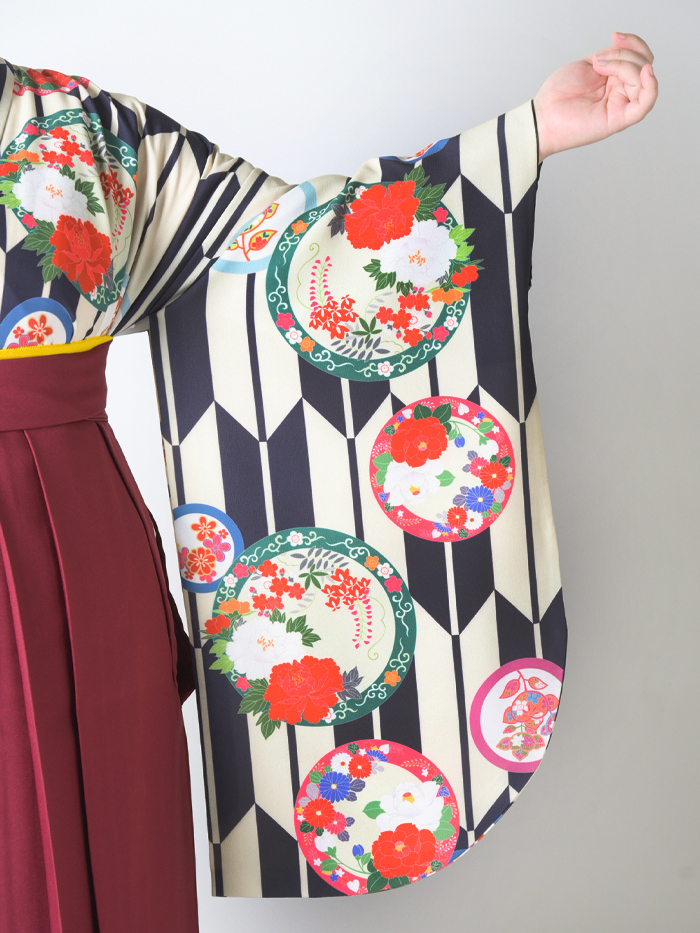 伝統的な袴姿の図案である「矢絣」をベースに明るい配色の花丸紋を配置。