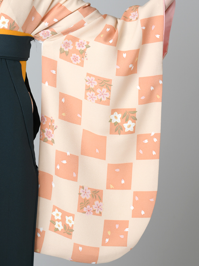 【二尺袖&袴レンタル】橙地 市松花結び+モスグリーン無地袴