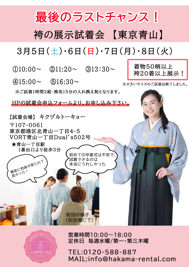 今期最後のレンタル袴試着会 3/5(土)~3/8(火)東京青山